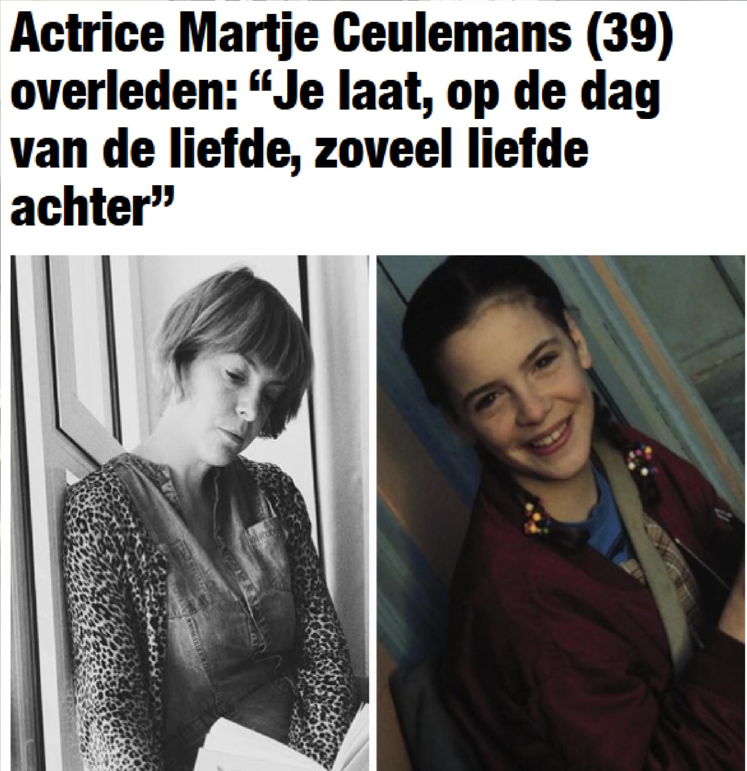 Actrice Martje Ceulemans is op amper 39-jarige leeftijd overleden. De Leuvense, die naast verschijningen op televisie ook in haar thuisstad Leuven erg veel bezigheden had, was onder meer te zien in Spoed en F.C. De Kampioenen.