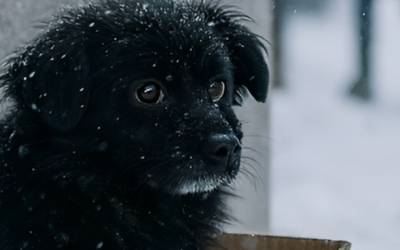 Het kleine zwarte hondje zat tegen de muur van een oud huis, in een versleten kartonnen doos, en keek naar de stroom voorbijgangers die haastig voorbijliepen.