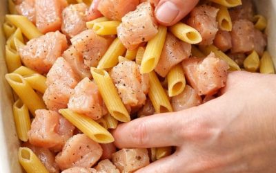Doe blokjes rauwe kipfilet met rauwe, droge penne en drie andere ingrediënten in een ovenschaal van aardewerk voor een pittig avondmaal dat ik altijd maak als ik even niet weet wat ik moet koken.