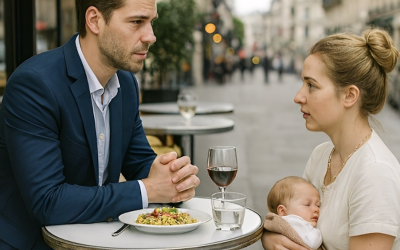 Zij knielde stilletjes naast zijn tafeltje op het trottoir, haar pasgeboren kindje dicht tegen zich aangedrukt. „Alstublieft, ik vraag geen geld—alleen een moment van uw tijd.”