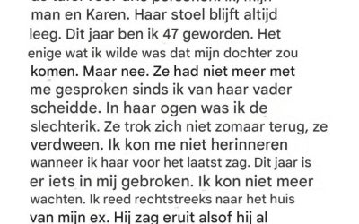 Mijn 47e verjaardag verliep in stilte, met slechts drie borden op tafel, één stoel onaangeroerd, een stille echo van de…
