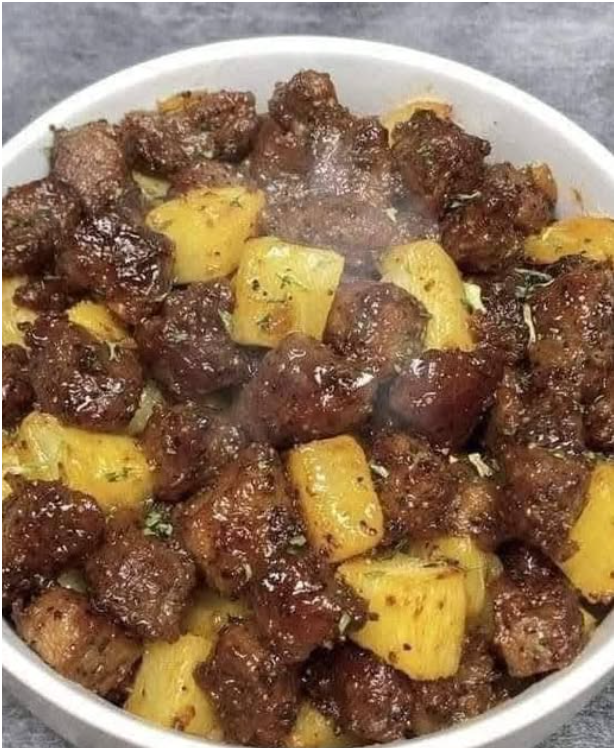 Snijd, zodra de aardappelen aan het bakken zijn, de biefstuk in blokjes van ongeveer 2,5 cm.