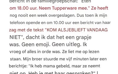 De korte rit naar mama leek een eeuwigheid te duren. Ik belde haar keer op keer, maar haar telefoon ging…