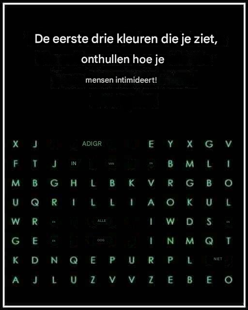 Kijk eens goed naar de onderstaande afbeelding. De eerste drie kleuren die je ziet, laten zien hoe je anderen van nature intimideert – of dat nu door zelfvertrouwen, intelligentie, creativiteit of pure aanwezigheid is.