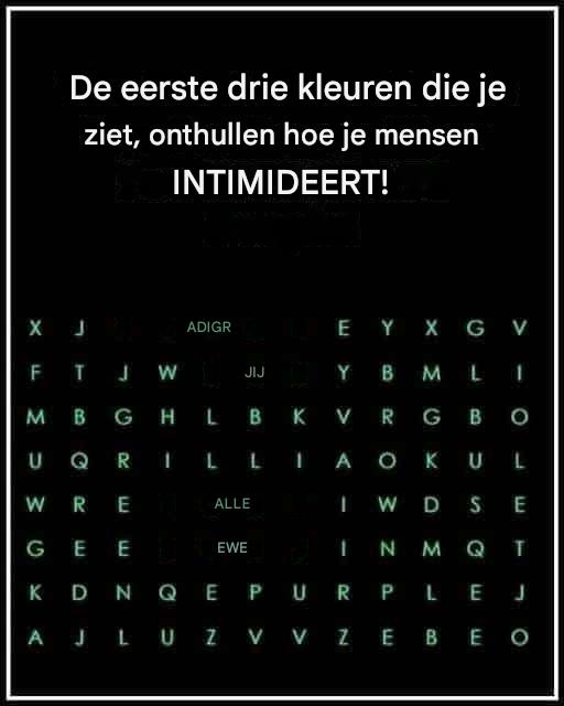 Kijk goed naar de afbeelding hieronder. De eerste drie kleuren die je ziet, zouden laten zien hoe je anderen van nature intimideert – of dat nu door zelfvertrouwen, intelligentie, creativiteit of pure aanwezigheid is.