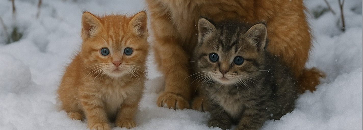 Met moeite vond hij een paar bevroren stukjes gehaktbal en wat kippeningewanden. Hij bracht het naar de kittens, liet hen eerst eten, en at daarna zelf de restjes op. De kittens, verzadigd, nestelden zich onder zijn buik, snorden tevreden en duwden hun neusjes tegen hem aan.