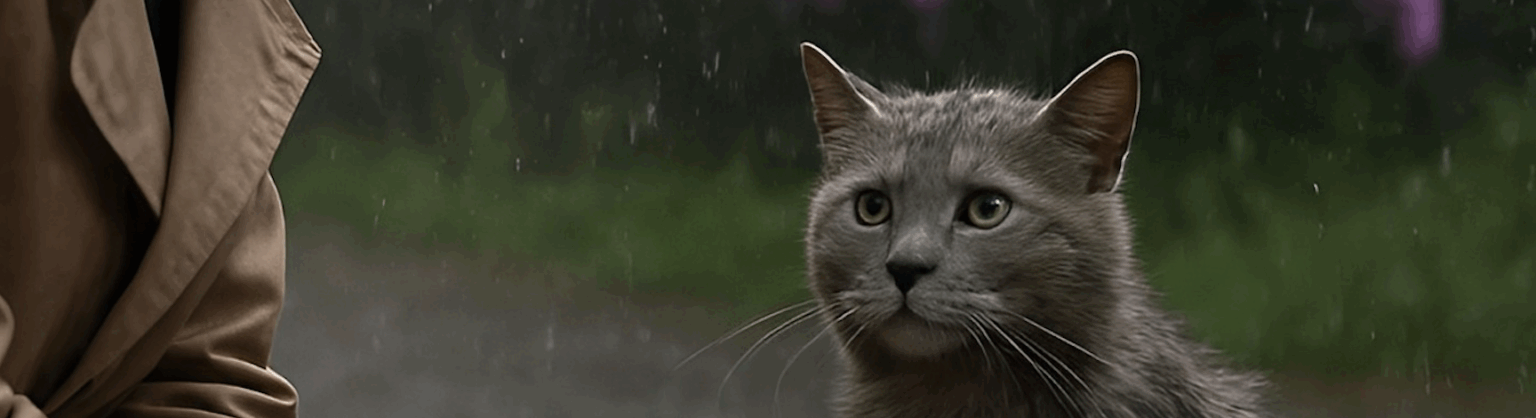 Een kletsnatte, kale kat blokkeerde haar weg. Ze ging precies op het enige droge plekje tussen de plassen zitten en miauwde: