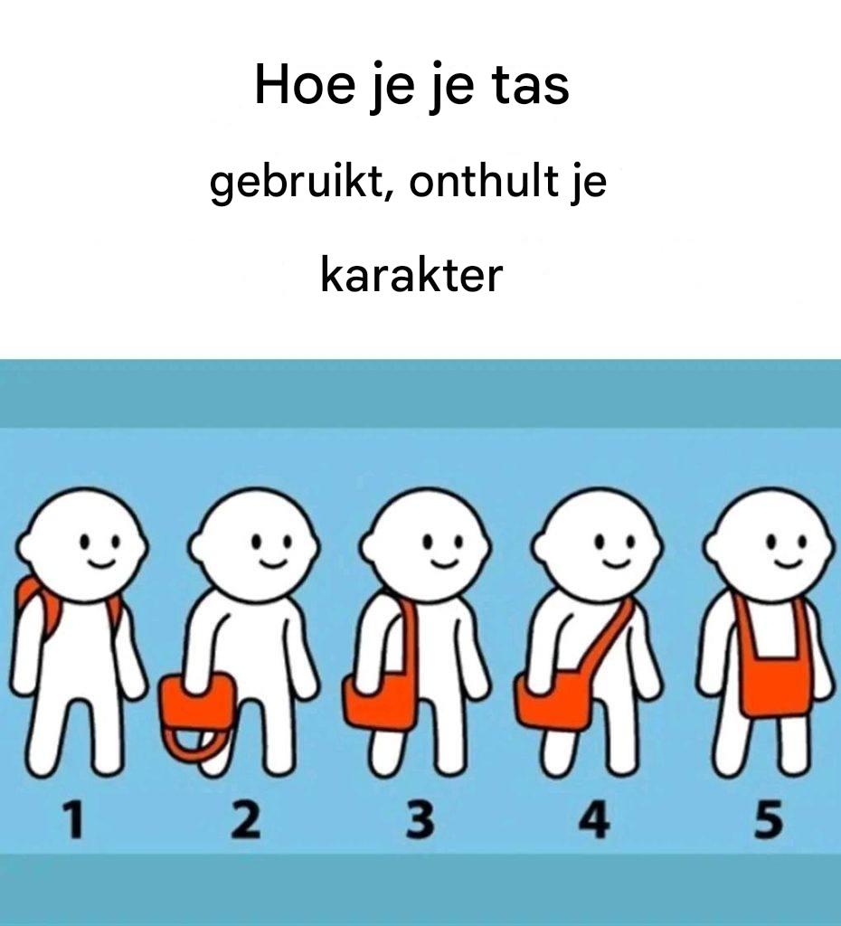3. 3. Op de schouder Mensen die hun tas graag op de schouder dragen, lezen meestal ook graag. Deze positie stelt je in staat om in een oogwenk je favoriete boek uit je tas te halen. Ze zijn meestal erg bedachtzaam en vallen waarschijnlijk voor je in slaap tijdens een monoloog die ze samen hebben.