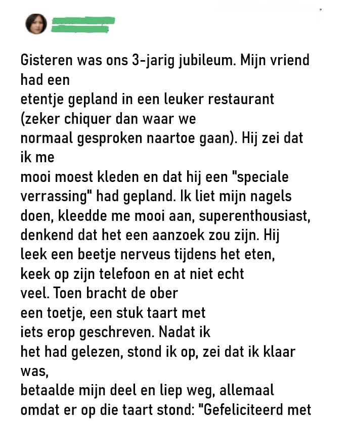Dus toen onze trouwdag eraan kwam en hij me vertelde dat hij een reservering had gemaakt bij een chique restaurant in het centrum en dat hij een « verrassing » in petto had, wist ik niet alleen wat er ging gebeuren, ik wist het ook zeker.