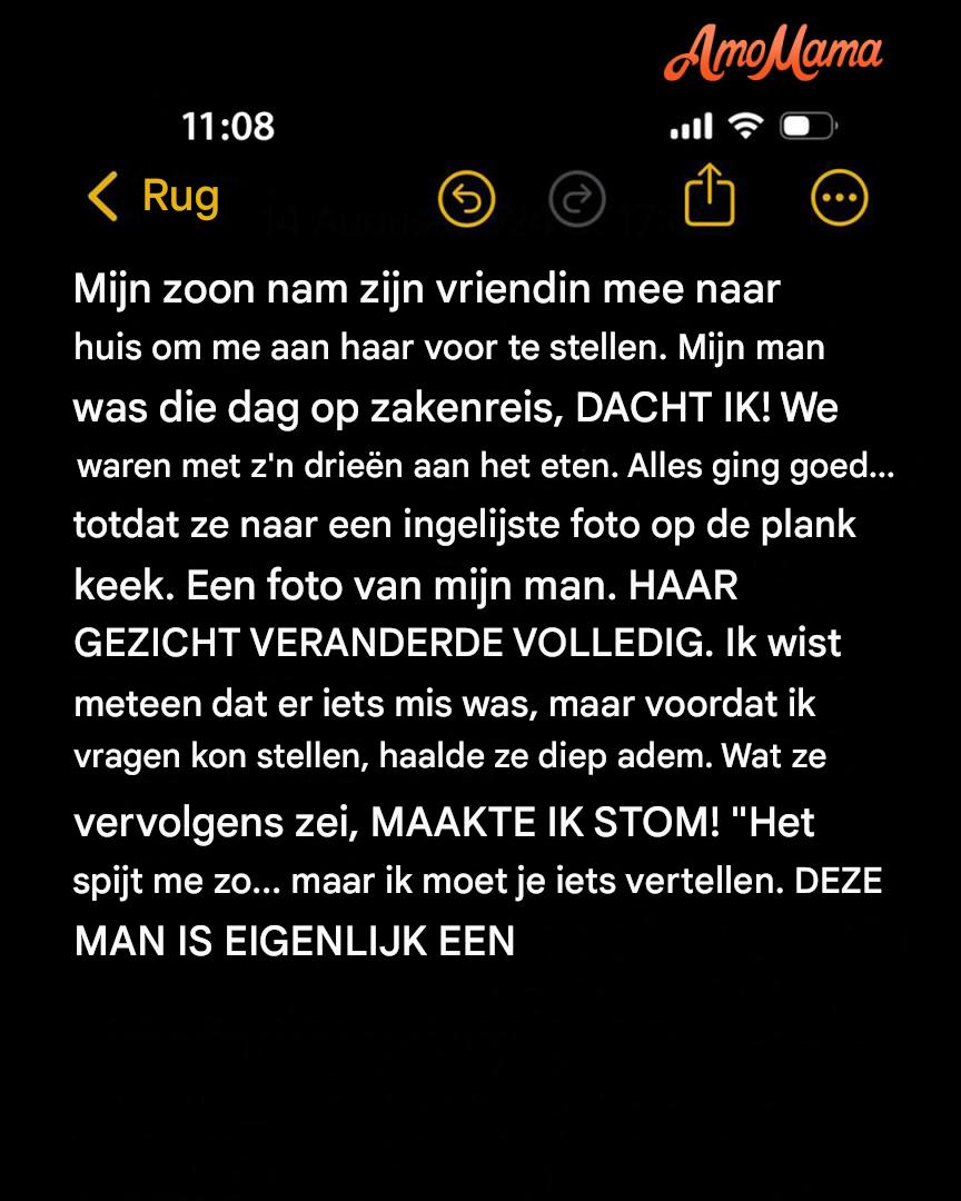 « Perfect, » zei ik soepel, terwijl ik een stap naar binnen deed. « Ik hoopte al dat je dat zou zeggen. Want Ryan besloot me aan zijn vriendin voor te stellen. En toen we elkaar voor het eerst ontmoetten, noemde ze jou. Dus ik hoop dat je een verklaring paraat hebt. »