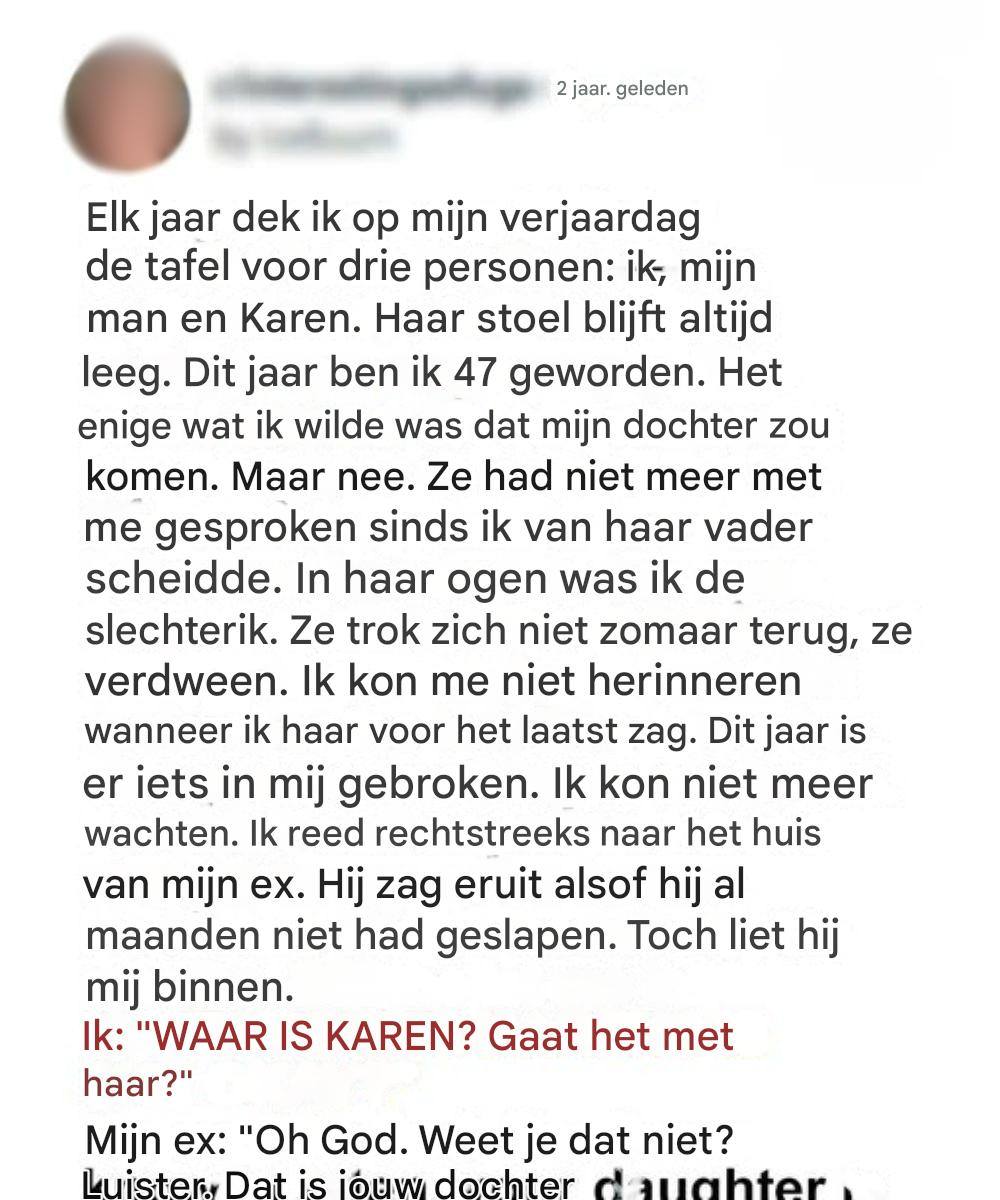 Samen gingen we naar mijn ex-man Nigel, die ongemakkelijk bekende dat hij de kaart kwijt was en vergeten was hem door te geven. De onthulling deed pijn, maar de inhoud van de brief gaf me kracht. Karen wilde weer contact en ik zou geen moment meer laten glippen. Die avond pakte ik mijn koffer en ging op pad om de afstand die de tijd had opgebouwd te overbruggen.