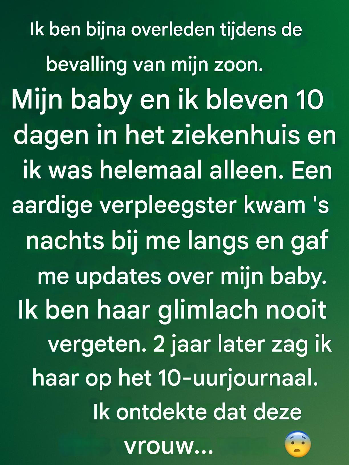 Een verpleegster kwam binnen glippen – zachte voetstappen, warme ogen, die kalme glimlach waardoor ik weer kon ademen. Ze ging naast me zitten, soms pratend, soms gewoon om me gezelschap te houden terwijl ik huilde zonder dat ik dat wilde.