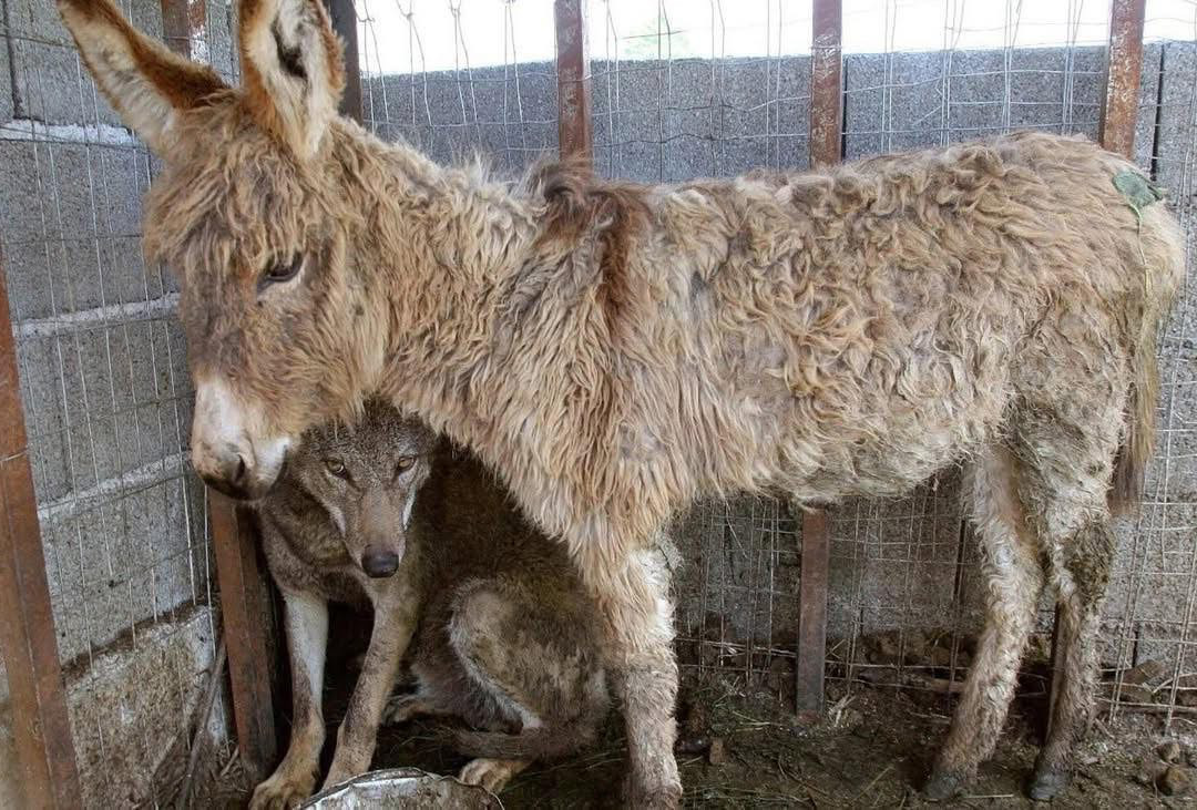 De wolf keek de ezel recht in de ogen, en de oude ezel beantwoordde die blik. Geen aanval volgde, geen agressie. In plaats daarvan ontstond er een stille verstandhouding, een onverwachte band tussen twee zielen die elkaars lot leken te begrijpen.