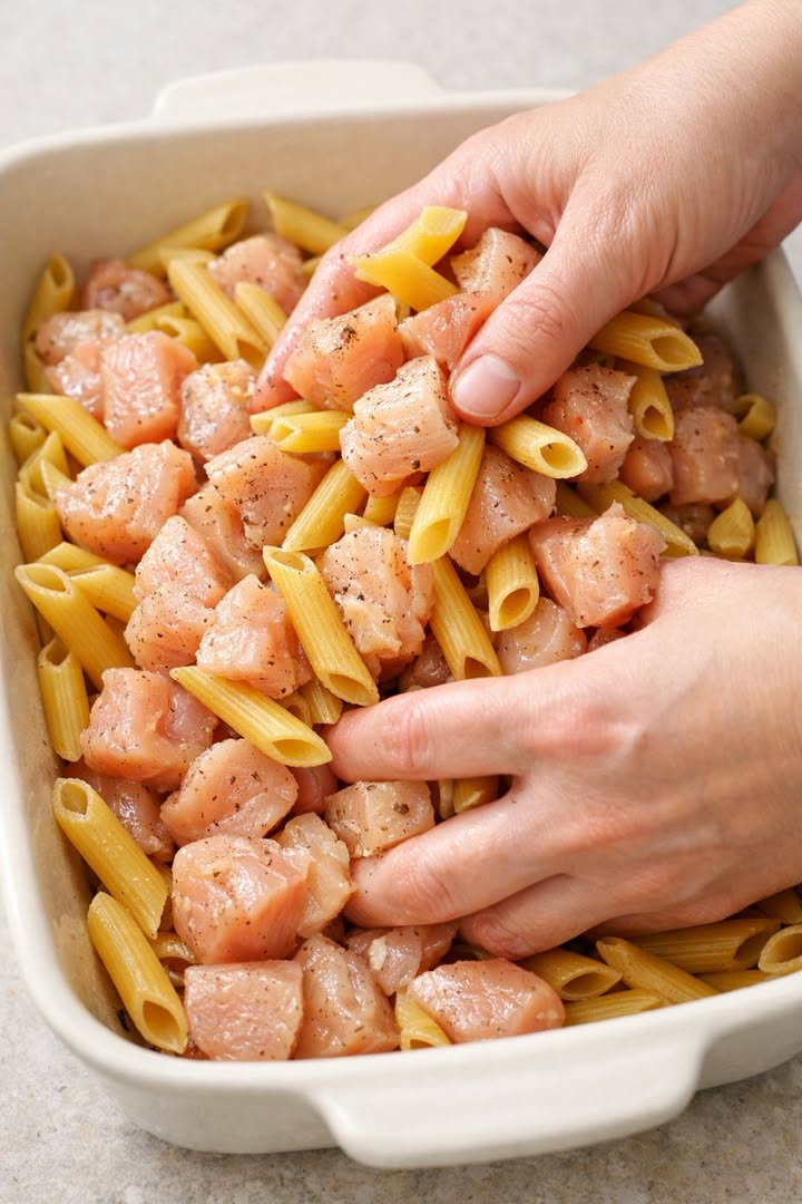 Voeg de in blokjes gesneden rauwe kipfilet en de rauwe droge penne pasta direct toe aan de aardewerken ovenschaal. Gebruik schone handen of een grote lepel om ze gelijkmatig te verdelen, zodat ze goed gemengd zijn.