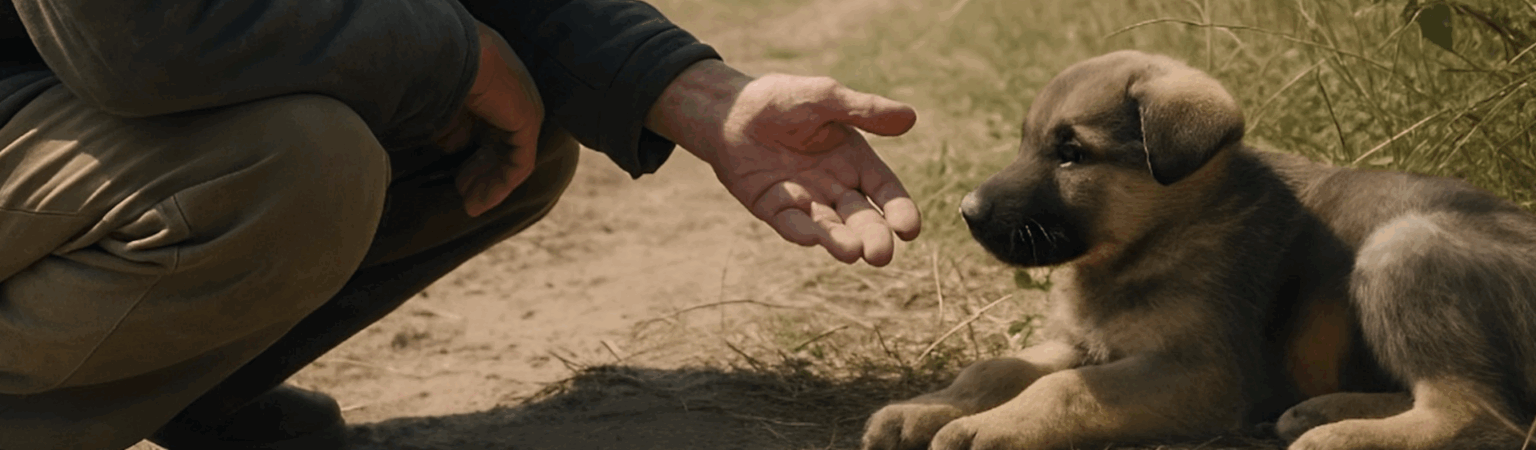 Haar vingers waren niet meer zacht. Met een ruk greep ze de pup bij zijn nekvel en tilde hem omhoog.