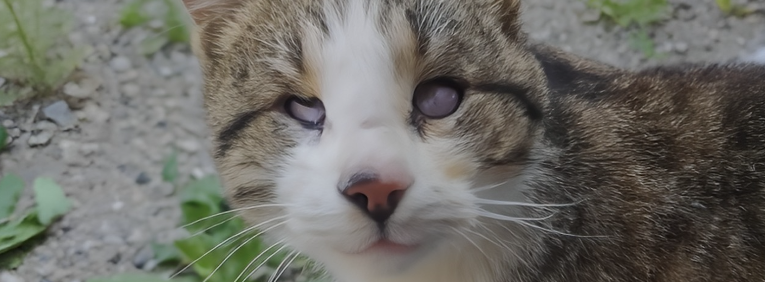 De volgende dag gingen de kat en ik naar de dierenarts. De arts stelde vast dat één oog volledig ontbrak en dat er op het andere oog een tweede ooglid zat. Om dit oog te laten zien, moest het behandeld worden met druppels.