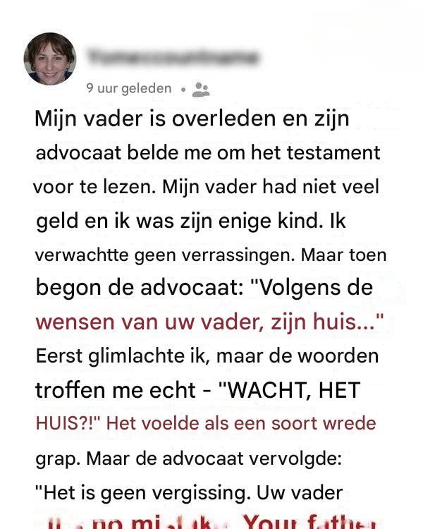 Ik verwachtte geen verrassingen. Maar toen begon de advocaat: « Volgens de wensen van uw vader, zijn huis… »