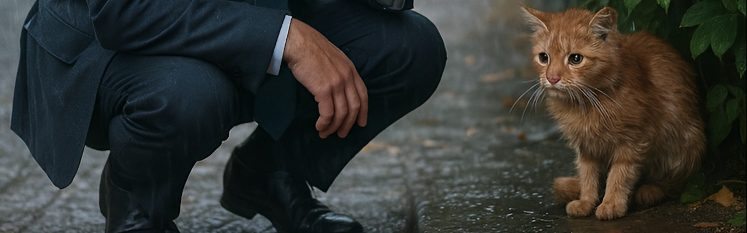 Onder een brede struik zat een piepklein grijs kitten in de stromende regen, doorweekt tot op het bot. Het trilde over zijn hele lijf en toen het de man zag, probeerde het geluid te maken — zijn mond ging open, maar er kwam geen geluid uit. Alles leek stil te staan: de kou, de uitputting, de honger. De man zuchtte diep.