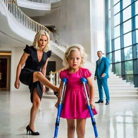 Midden in de luxe woonkamer zat zijn prachtige dochter opgerold op de grond naast een omgevallen glas water. Haar kleine lichaam trilde van het snikken. Haar speciale roze orthopedische krukken, versierd met haar favoriete vlinderstickers, lagen ernaast. Victoria stond boven haar, haar armen over elkaar, haar gezicht vertrokken van walging.