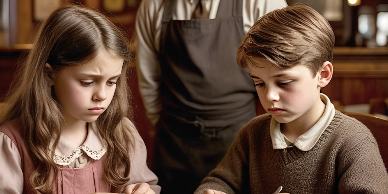 De jongen in een gescheurde jas, duidelijk geërfd van iemand ouder. Het meisje in een dun jasje, trillend als een esdoornblad. Hun rubberen laarzen met gaten waren doorweekt. In hun ogen de angst die alleen honger en eenzaamheid leren.