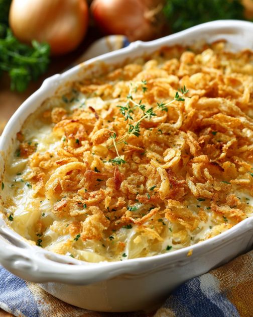 Deze ovenschotel combineert prachtig met eenvoudige, stevige hoofdgerechten. Ik serveer hem graag bij gebraden of gebakken kip, gehaktbrood of een stoofpot. Hij is ook heerlijk met gebakken ham of varkenskarbonades, omdat de zoetheid van de uien zo goed samengaat met het zoute vlees. Voeg een frisse groene salade of gestoomde sperziebonen toe om de rijkdom te compenseren, en misschien wat aardappelpuree of geroosterde aardappelen als je een grote groep te eten geeft. Voor een lichtere maaltijd kun je deze ovenschotel zelfs als hoofdgerecht serveren met een grote salade en wat knapperig brood om al die boterachtige smaak op te slurpen.