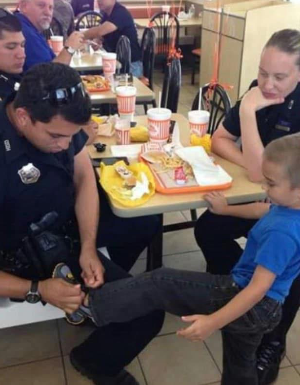 Een politieagent hielp een klein jongetje zijn schoen strikken, en seconden later verstijfde iedereen in het restaurant