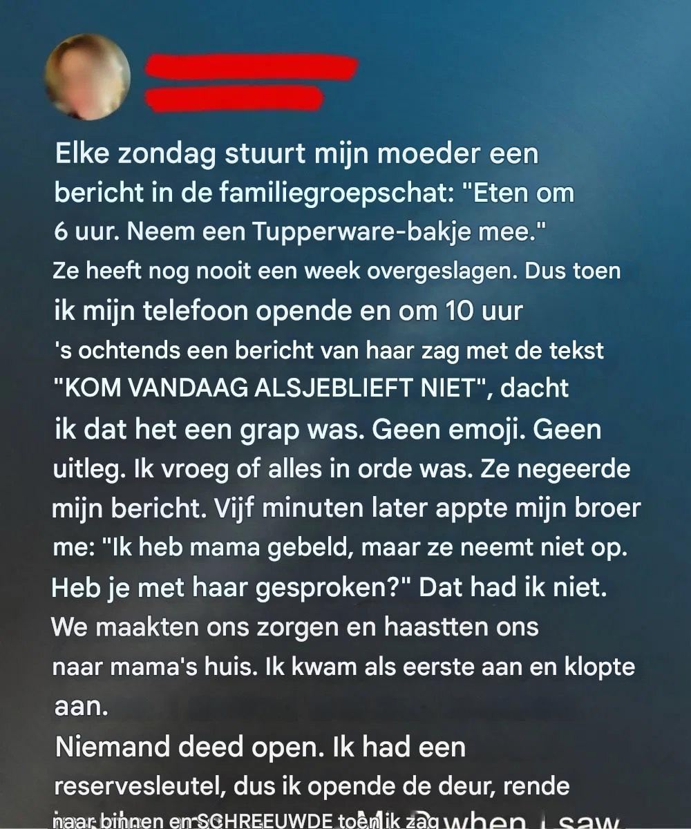 Dus toen ze op een zondagmiddag een kort berichtje stuurde met de simpele boodschap: « Kom alsjeblieft vandaag niet », zakte de moed me in de schoenen. Geen uitleg. Geen smiley. Slechts vijf onheilspellende woorden. Mijn broer en ik wisselden een blik en wisten meteen dat er iets niet klopte. We negeerden het bericht, stapten in de auto en reden rechtstreeks naar haar huis, terwijl de angst in onze borstkas toenam.