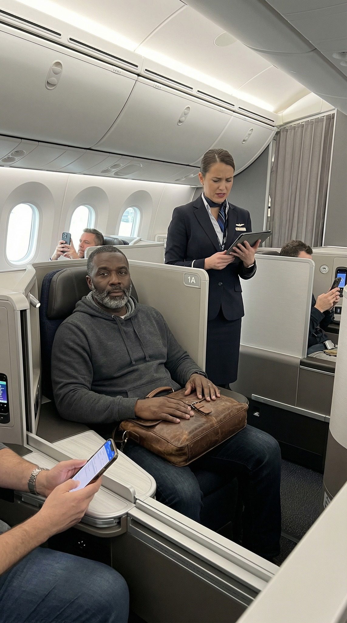 Nathaniel deed iets wat de meeste mensen niet zouden doen: hij bleef zitten en bleef kalm. Hij verhief zijn stem niet, gaf geen tegengas, maar vroeg alleen of ze het even kon navragen bij het grondpersoneel, omdat fouten nu eenmaal gebeuren en hij er absoluut zeker van was dat hij op de juiste stoel zat. Haar collega, Ethan Barnes, kwam aan met de onmiskenbare houding van iemand die er al van overtuigd was dat de persoon die ze benaderden het probleem was, niet het systeem. Zijn ogen dwaalden naar Nathaniels hoodie, naar zijn schoenen, naar de versleten aktetas die onder de stoel was gepropt, en vervolgens weer terug naar Claires tablet, alsof de realiteit toestemming nodig had om geaccepteerd te worden. « Meneer, dit is niet ingewikkeld, » zei Ethan, met een korte, scherpe toon, « mensen proberen de hele tijd stiekem een upgrade te krijgen, maar we tolereren geen verstoring. Gaat u alstublieft ergens anders zitten. »