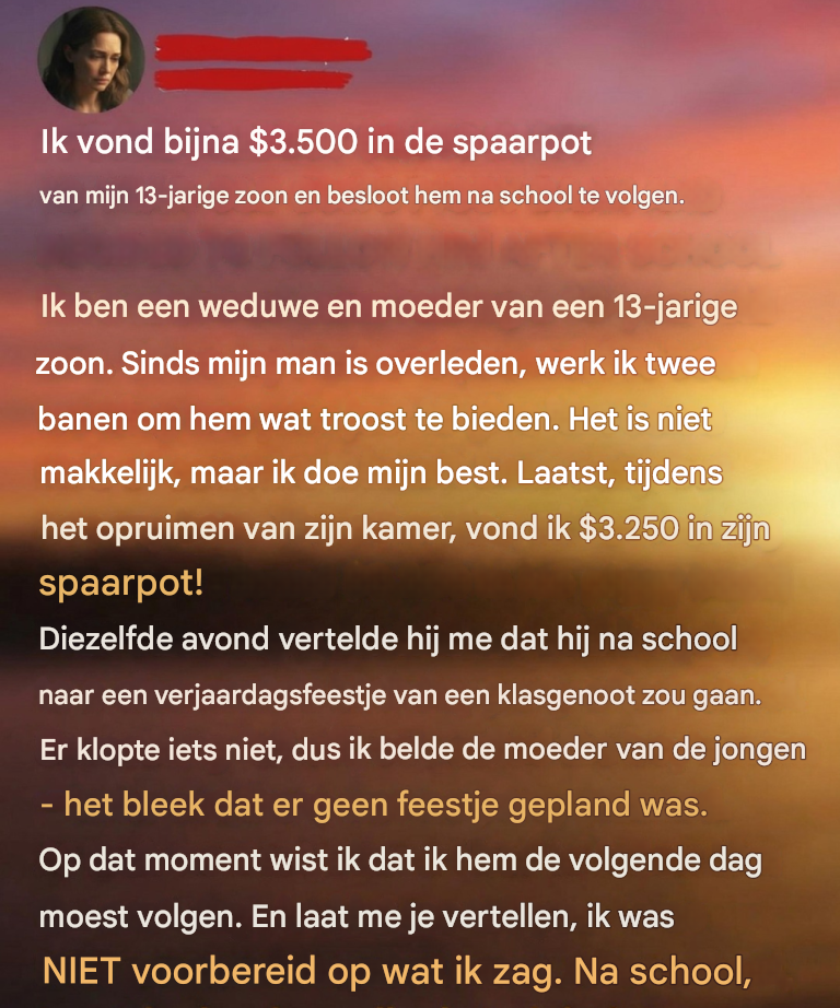 Het was niet het soort verrassing dat woede of achterdocht opwekt. Het was stiller dan dat – een onrust die zich langzaam in mijn borst nestelde. Sinds mijn man was overleden, was het leven een delicate evenwichtsoefening geworden. Lange werkdagen, constant budgetteren en het alleen opvoeden van een dertienjarige lieten weinig ruimte voor verrassingen. En toch, toen ik de spaarpot opende, zaten er niet alleen munten in, maar ook opgevouwen bankbiljetten. Honderden. Genoeg om mijn handen te laten trillen.