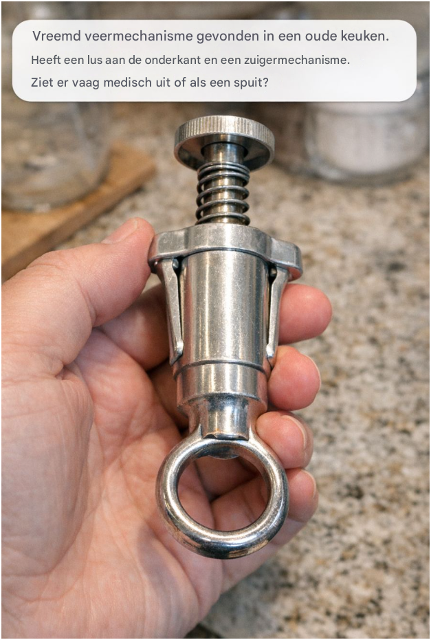 In de stoffige hoekjes van een oude keuken, onder lagen vergeten keukengerei, lag een merkwaardig apparaat. Het ontwerp was intrigerend, een mengeling van mechanisch en mysterieus. Dit vreemde apparaat, met zijn veerbelaste zuiger en een lus aan de onderkant, wekte de nieuwsgierigheid van iedereen die het tegenkwam. Was het een overblijfsel uit een vervlogen tijdperk van medische experimenten, of had het een meer bescheiden doel gediend in het dagelijks leven?
