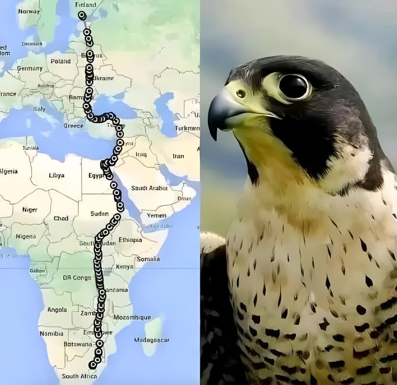 Een vrouwtjesvalk, uitgerust met een GPS-tracker, begon aan een indrukwekkende reis van Zuid-Afrika naar Finland, waarbij ze dagelijks gemiddeld 230 kilometer aflegde