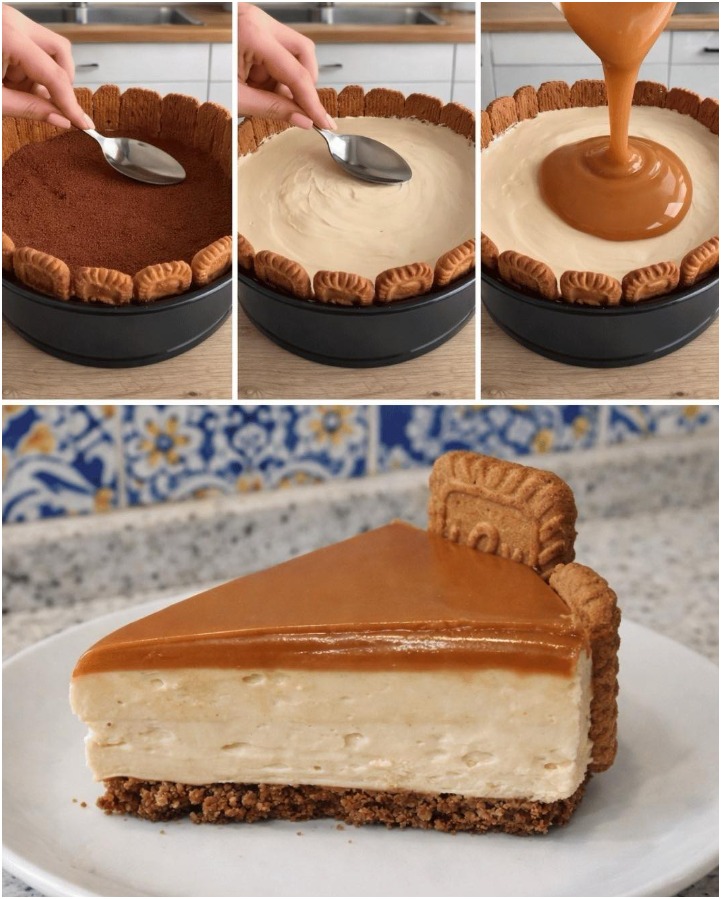 Een no-bake Biscoff cheesecake met een glanzende topping en koekjesdecoratie.
