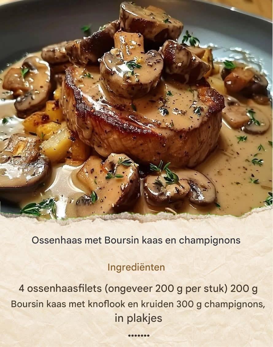 Ossenhaas is een stuk ossenhaas, bekend om zijn smelt-in-de-mond textuur en milde smaak. Het wordt beschouwd als een van de meest luxueuze stukken, is snel gaar en combineert heerlijk met smaakvolle sauzen: peper, rode wijn of – zoals in dit recept – romige Boursin-kaas en champignons .