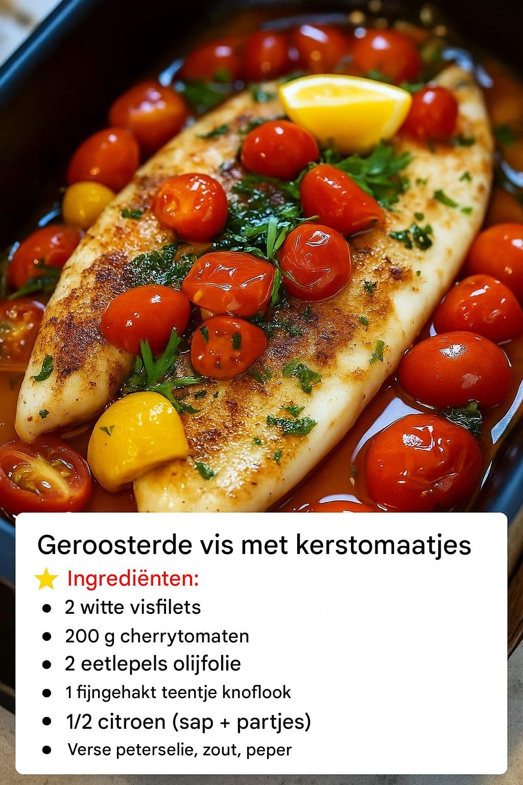 Deze mediterrane vis uit de oven is een eenvoudig, snel en zonnig gerecht. Filets van witte vis worden subtiel gebakken met cherrytomaatjes, citroen, olijfolie en verse kruiden.