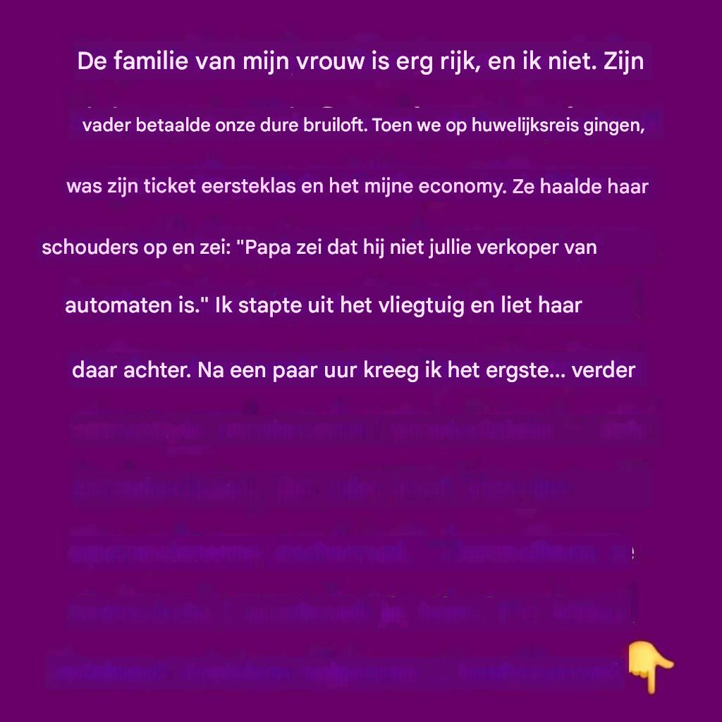 « De familie van mijn vrouw is erg rijk, en ik ben een gewone werknemer die van salaris naar salaris leeft. Haar vader betaalde de hele bruiloft. Toen we in het vliegtuig stapten voor onze huwelijksreis, vloog mijn vrouw first class en had ik een economy ticket. Ze haalde haar schouders op en zei: ‘Dat is erg, maar papa zegt dat hij niet jouw geldautomaat is.' »