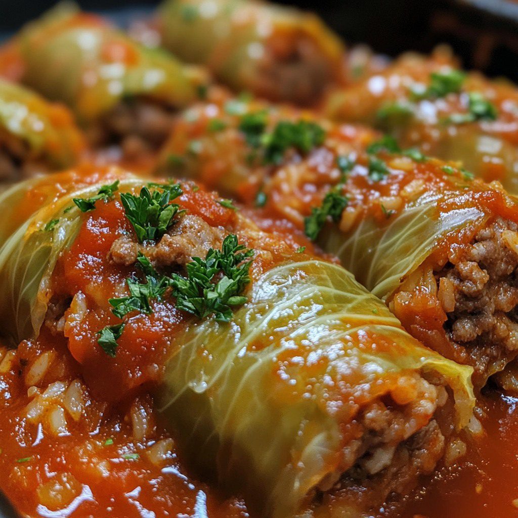 Gevulde koolrolletjes met rundvlees en rijst, zelfgemaakte tomatensaus