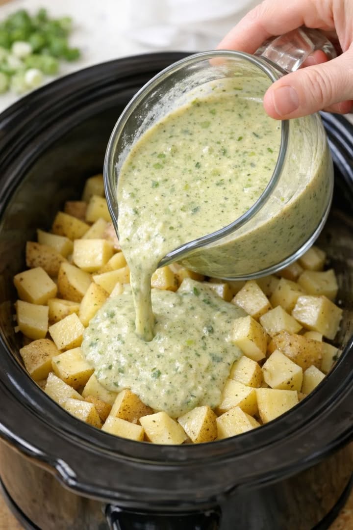 Giet deze colcannon-roomsaus gelijkmatig over de rauwe, in blokjes gesneden goudgele aardappelen in de slowcooker. Zorg ervoor dat zoveel mogelijk aardappelen bedekt of ondergedompeld zijn. Schud de slowcooker voorzichtig of roer lichtjes om de saus te verdelen zonder de aardappelen te pletten.