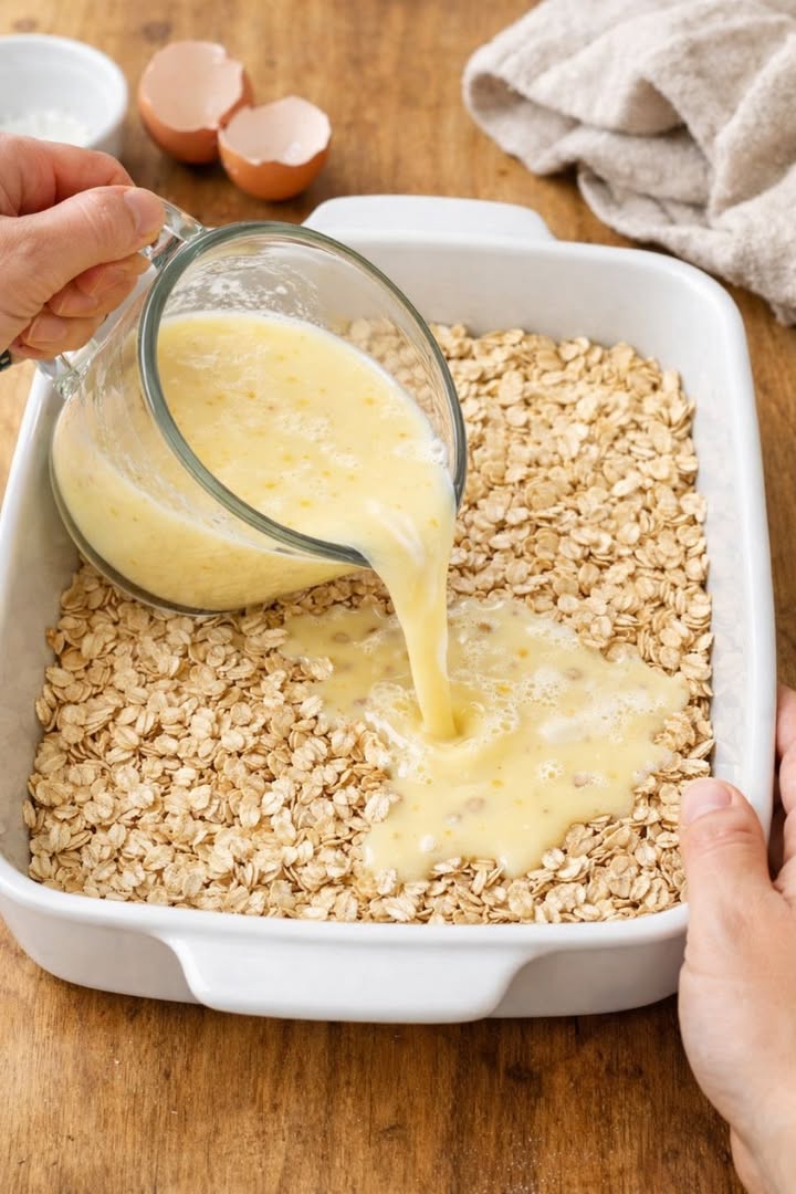 Giet het melk- en eimengsel langzaam over de rauwe havervlokken in de ovenschaal en zorg ervoor dat alle havervlokken bedekt zijn. Kantel de schaal voorzichtig of roer de havervlokken met een lepel zodat alles goed bevochtigd is en er geen droge plekken ontstaan.