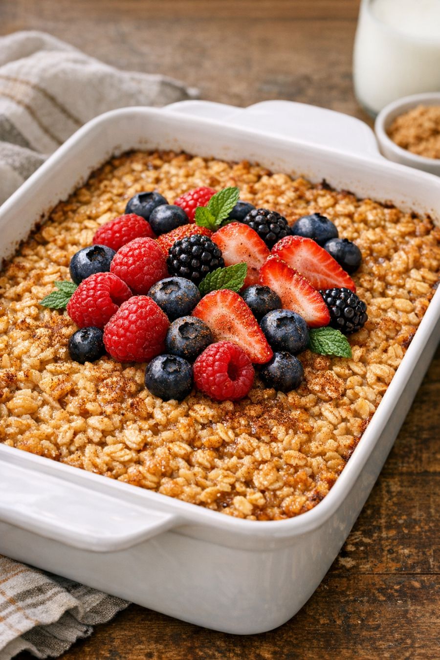 Deze ovenschotel met havermout in Amish-stijl is voor mij het ultieme comfortfood voor doordeweekse dagen: zes ingrediënten, één ovenschaal en bijna geen gedoe. De bereidingswijze is heerlijk eenvoudig: meng melk, eieren en een paar basisproducten uit je voorraadkast door elkaar en giet dit romige mengsel over rauwe havervlokken in de ovenschaal. Gebakken havermout zoals deze vindt zijn oorsprong in de keukens van de Pennsylvania Dutch, waar stevige, van tevoren te bereiden ontbijten zowel vullend als praktisch moesten zijn. Het resultaat is een warme, lichtzoete, lepelbare havermout die zijn vorm behoudt en net genoeg behoudt om in vierkantjes te snijden. Het is het soort ontbijt dat stilletjes een favoriet in huis wordt, omdat iedereen er steeds weer om vraagt.