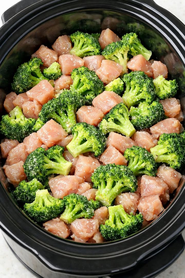 Giet het teriyaki-honingmengsel gelijkmatig over de kip en de bevroren broccoli. Roer alles voorzichtig door elkaar met een lepel, zodat de saus de kipstukjes en de groenten licht bedekt. Het mengsel moet eruitzien als rauwe kipblokjes en felgroene bevroren broccoli, gemengd in een glanzende saus in de slowcooker.