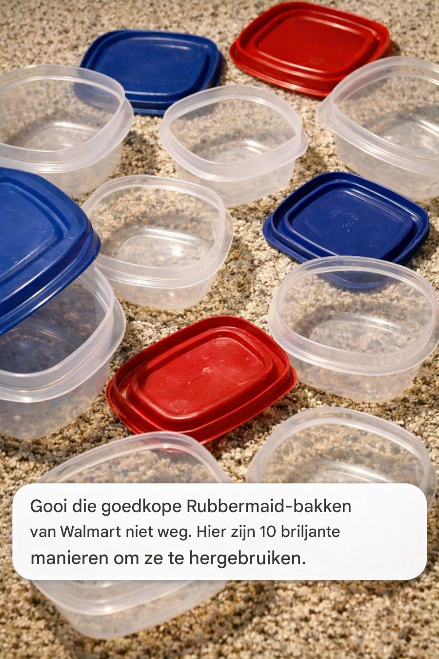 We kennen het allemaal: je koopt van die goedkope Rubbermaid-bakjes bij Walmart om eten in te bewaren, om ze vervolgens in de kast te zien staan, ruimte in te nemen en vaak zonder deksel. In plaats van deze betaalbare bakjes ongebruikt te laten staan, kun je ze op creatieve en functionele manieren in huis hergebruiken. Met een beetje fantasie kun je deze bakjes omtoveren tot handige opbergers, knutselspullen en nog veel meer.