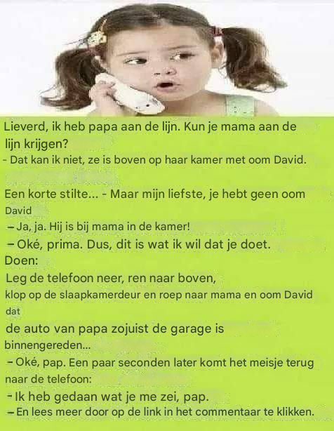 Een man wilde dolgraag met zijn vrouw praten om haar iets te vragen. Hij was niet thuis. Dus pakte hij zijn telefoon en draaide een nummer om haar te bereiken. Na een paar seconden nam iemand op. Het was een klein meisje. De vader vroeg haar toen: "Hallo lieverd, ik ben papa aan de lijn..." "Kun je mama aan de lijn krijgen?" Op dat moment deed het kleine meisje een onverwachte onthulling. Ze zei: "Dat kan ik niet, ze is boven in haar kamer bij oom David."
