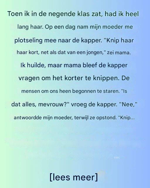 Mijn moeder merkte de verandering in mij niet. Of misschien wel, maar het kon haar niets schelen. Ze werkte lange dagen en kwam moe thuis, klagend over geld, haar baas of mijn ondankbaarheid. Op een avond verzamelde ik de moed om haar te vragen waarom ze me mijn haar had laten knippen. Ze keek me kil aan en zei: « Je werd te ijdel. Ik wilde je een lesje leren. » Toen pakte ze haar telefoon weer. Ik herinner me dat ik die avond naar bed ging met het gevoel dat er iets in me gebroken was.