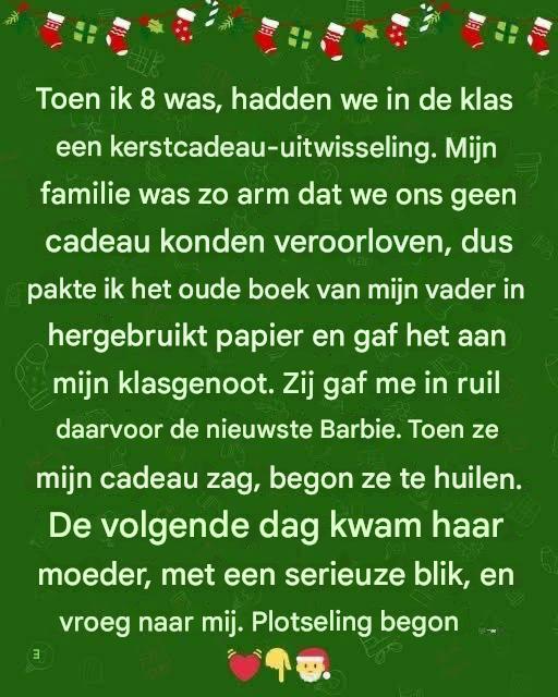 Op de dag van de cadeautjesruil gaf ze me een prachtig ingepakte doos met de nieuwste Barbiepop van het seizoen – dé pop waar iedereen het over had. Mijn hart zakte in mijn schoenen. Toen ze mijn cadeau openmaakte en de tranen in haar ogen sprongen, voelde ik de grond onder mijn voeten wegzakken. Schaamte overspoelde me. Ik dacht dat ik haar kerstmoment had verpest, dat ik haar het enige ‘tweedehands’ cadeau in de hele kamer had gegeven. Ik stond daar maar te willen verdwijnen, te jong om onze situatie onder woorden te brengen, te bang om de aandacht te vestigen op wat we niet hadden.