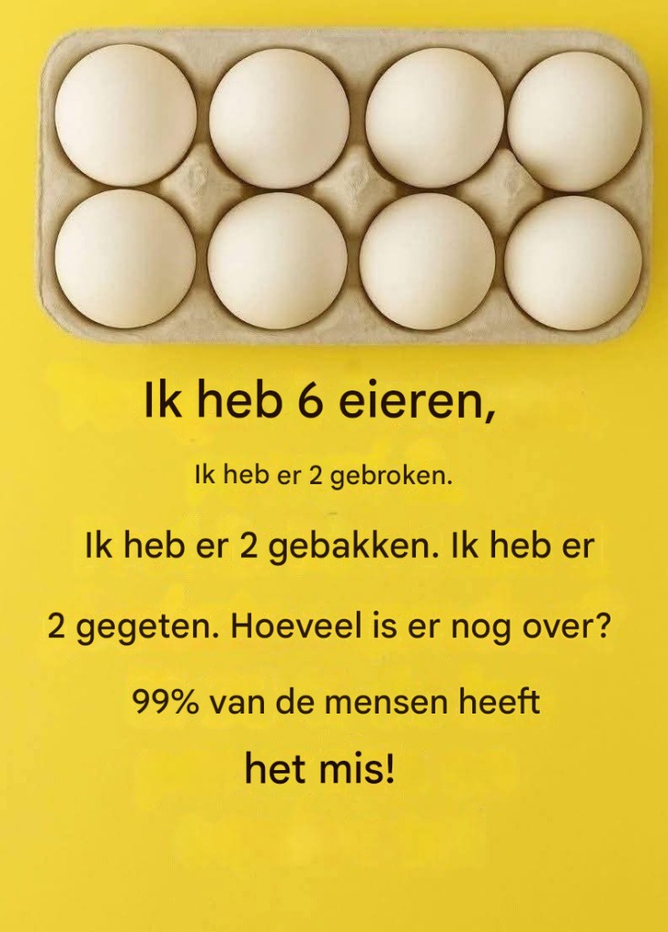En inderdaad! De meeste gebruikers antwoorden fout zonder na te denken. Sommigen zeggen dat er 0 eieren over zijn, anderen 4, weer anderen 2… maar wat is het juiste antwoord?