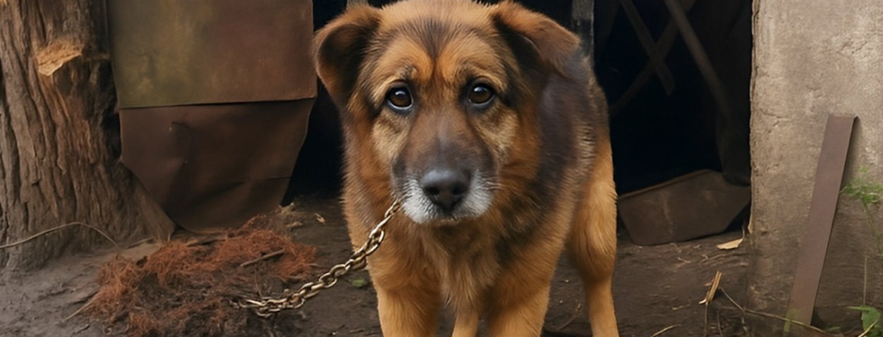 Deze hond heeft jarenlang vastgezeten aan een ketting. Degenen die hem daar hadden vastgemaakt, namen niet eens de moeite om een hok neer te zetten of een minimale schuilplaats tegen het slechte weer te bieden.