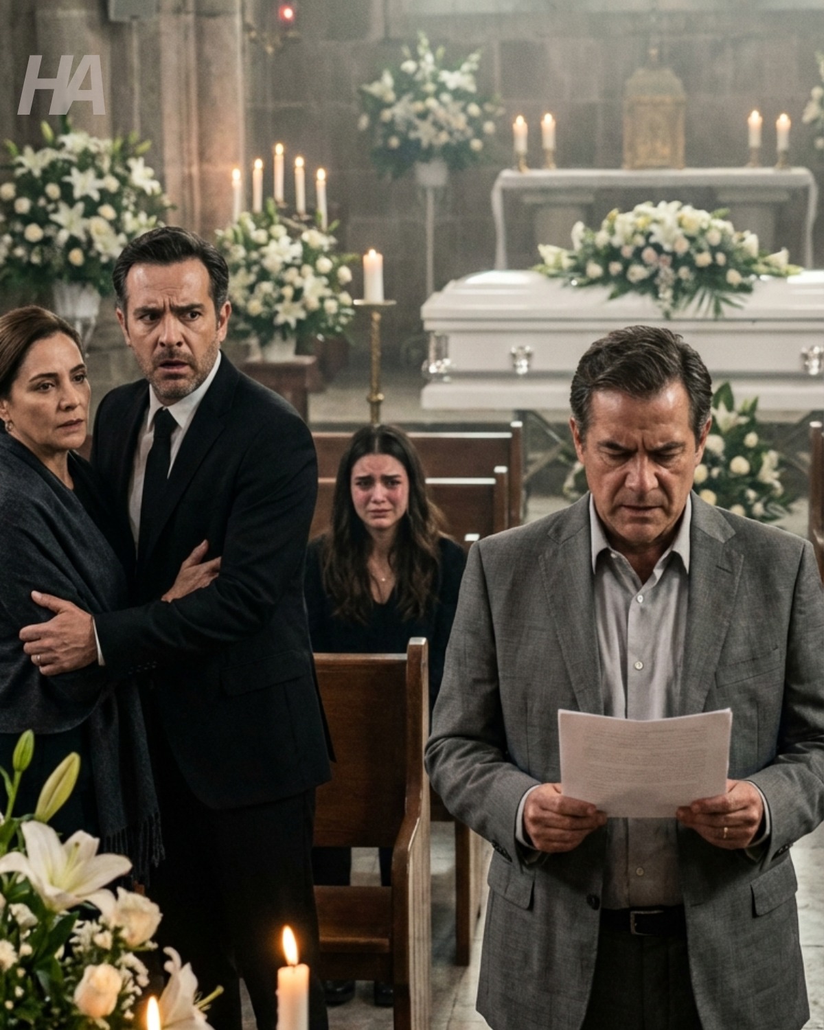 ‘Neem me niet kwalijk,’ zegt hij, en zijn stem doorbreekt de stilte in de kerk als een hamerslag. ‘Mijn naam is Daniel Hayes. Ik ben de advocaat van Lily Reed.’