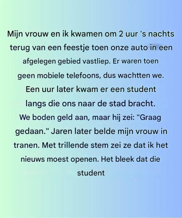 Eindelijk eindelijk ik de ware betekenis van zijn simpele woorden. “Geef het door” ging niet over het terugbetalen van een gunst – het ging over het levend houden van de geest van vriendelijkheid. U kunt een paar minuten de tijd nemen om de deur te sluiten en deze aan de linkerkant te laten liggen.