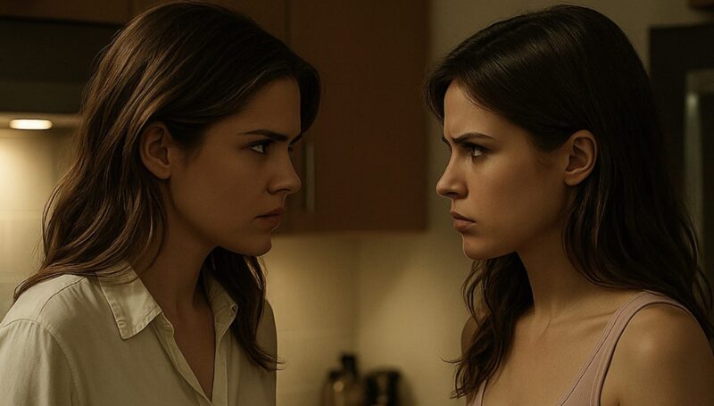 Marina ging haar slaapkamer binnen – de enige plek in het appartement die nog aan een eiland van orde deed denken. Ze deed haar jasje uit, hing het zorgvuldig over de rugleuning van een stoel en ging op de rand van haar bed zitten. Haar hoofd bonsde. Ze kon het gedempte gemompel uit de kamer van haar zus horen, en daarna drong Polina’s stem — vervormd door gespeeld verdriet — door de muur heen.
