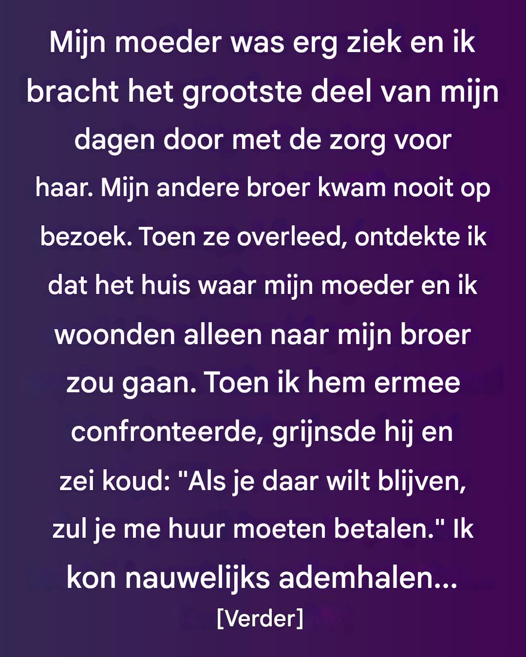 Als ik terugdenk aan die lange nachten in het ziekenhuis, ruik ik nog steeds het ontsmettingsmiddel en hoor ik de constante piep van de monitor naast het bed van mijn moeder. Ik sliep nauwelijks, bang dat als ik mijn ogen sloot, ze weg zou glippen zonder dat ik het wist. Mijn broer kwam nooit opdagen — niet één keer. Hij had altijd een excuus: werken, reizen, « te emotioneel » zijn om haar zo te zien. Ik probeerde het hem niet kwalijk te nemen en zei tegen mezelf dat iedereen anders met ziekte omgaat.